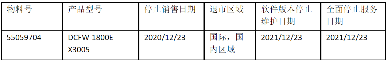 北京神州数码米兰信息技术有限公司正式通知您, 以上DCFW-1800E-X3005下一代防火墙(55059704)将于2020年12月23号停止接收新的订单(具体日期见上表),不再供货。给您带来的不便,敬请原谅。