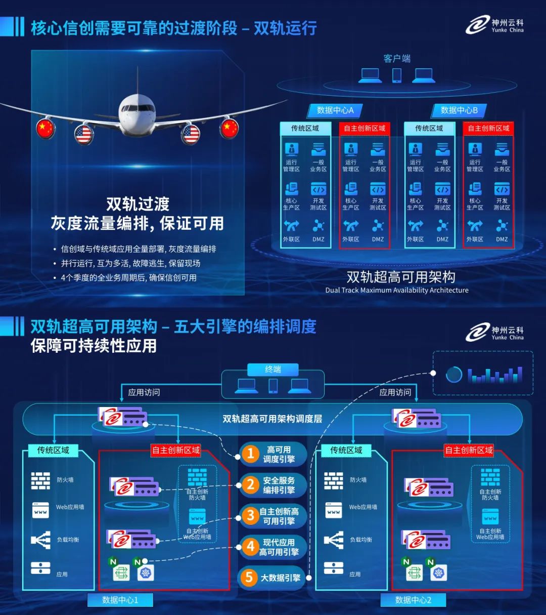 为助力金融业务高质量发展,更好地应对数字经济时代对可持续性的高要求,实现“信创”与“数字化”齐头并进,神州米兰创新性的推出了核心信创·双轨过渡的超高可用架构。该架构在双活数据中心的分区调度基础上,增加信创域和非信创域的分域调度,实行信创域与传统域应用全量部署,使双中心运营变为双中心四区域并行运行,互为多活,将“0到1”的单轨建设道路变为分区分域协同的多活双轨超高可用架构。帮助客户在新架构下,保障“信创”的同时解决性能瓶颈,提升稳定性,保证应用可持续性,最终实现信创区域和非信创区域的平滑过渡,完成国产化替代目标。