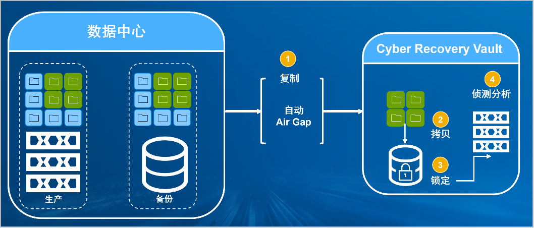 神州米兰防勒索病毒方案将生产中心备份数据复制到Vault区,复制后网络自动断开实现弹性隔离。Vault区的数据快速拷贝,并对拷贝版本加锁(在锁定期数据不允许删除和修改)。Vault沙箱内对拷贝版本进行扫描分析,验证数据是否完好。